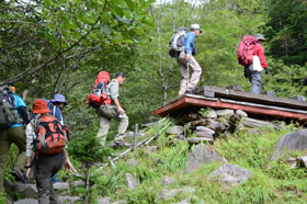 硫黄岳にはザレた登山道と最後の岩場を乗り越えて、平坦でだだっ広い頂上に着く。記念写真後、爆裂火口を眺めたり、頂上直下のトウヤクリンドウの群落を観察する。頂上から岩場を慎重に下り赤岩ノ頭でホットする。長い下りをこなし、赤岳鉱泉にて昼食とした。北沢沿いの登山道を下り、堰堤広場に到着すると安堵感から一気に疲れが出てくる。言葉少なくなり淡々と林道を下る。美濃戸口には予定より若干遅れたが無事到着。帰りの高速では大渋滞で立川には20時30分過ぎの到着となった。受講生は3000m近い標高を経験してまた一歩前進した山行となった。