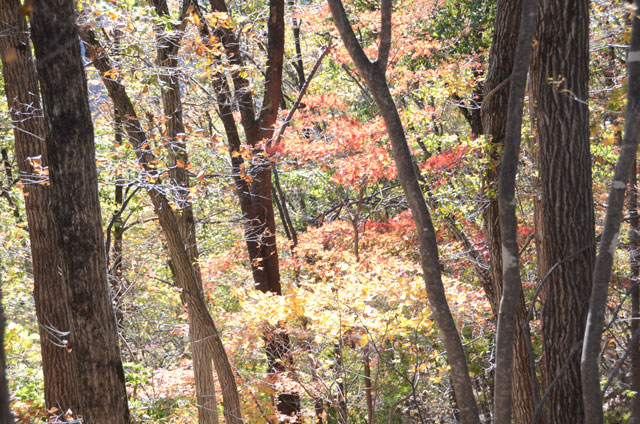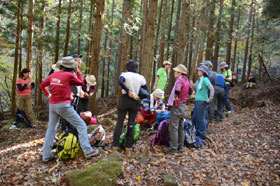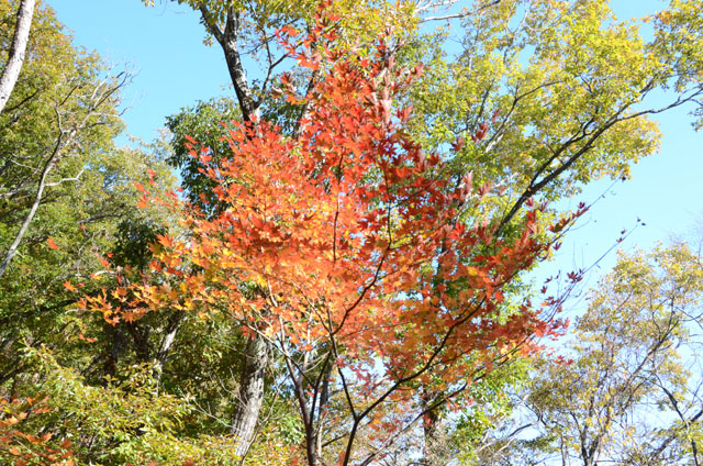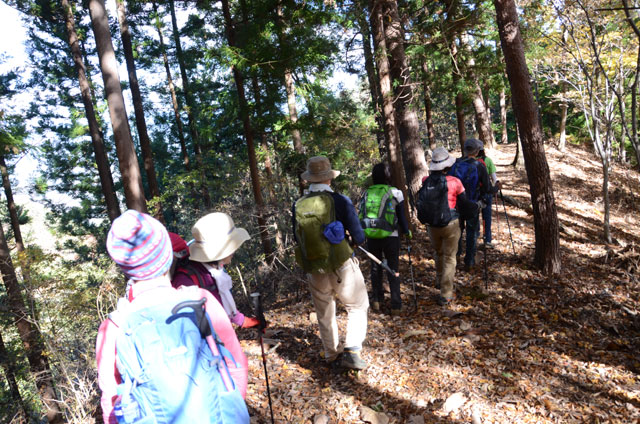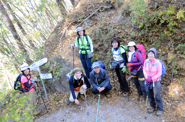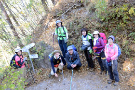 日向で早めの昼食を富士山を眺めながら取る。高畑山から急な下りがあるのでストックを使用する。穴路峠まで下り、秋山山地の最高峰である倉岳山への登りを頑張る。赤色の紅葉が少ないものの、黄色の紅葉が最盛期である。倉岳山で再び富士山と対面し、展望を堪能する。倉岳山からの急な下りを慎重に通過し、立野峠で一休みする。