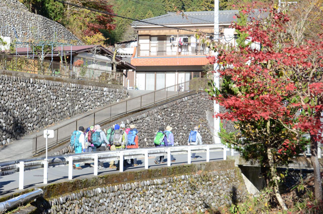 ここも急坂でスタッフの声が飛ぶ。休憩を取りながら50分ほどで岩場の急坂に到着。3点支持をスタッフから指導され、班リーダーの後を忠実に登っていく。登りきったところに金網で囲まれたお堂が見えてきた。展望のない惣岳山山頂である。このお堂は青謂神社の奥宮で、少し下った所に青謂の井戸と呼ばれる霊泉があり、社名の由来になったといわれているらしい。ここでも由緒ある神社らしくりっぱな彫刻が施されている。展望もないこともあり記念写真を撮って早々に下山にかかる。通常は関東ふれあいの道を下って御岳駅におりるのだが、混雑を避けるべく沢井駅へ向かう。少し長い下りになったが、受講生は体調を崩したり、足の攣りも発生することなく元気に行動していた。16時ちょうどに駅に到着し、トイレ前の広場で実習終了のあいさつ、12月の座学の案内、ストック使用後のアドバイスを聞いてもらい解散とした。