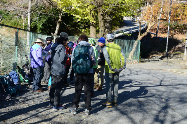 6期初級登山教室の2山目は雲一つない快晴となり、この天気では奥多摩の山は相当な人手が予想されることを頭に描いて集合場所に向かう。気温3度の中、軍畑駅で準備していると、到着する奥多摩方面行きの電車から、続々と登山者が降りてくる。トイレを済ませて出発していくのだが、女子トイレだけは長蛇の列。到着した受講生には高源寺にあるトイレを利用するようお願いし、駅から少し離れた広場まで移動し朝礼を行う。15分遅れの出発となり、到着した高源寺のトイレは1か所しかなく、ここでも時間を取られ、現在位置を地図とコンパスで確認後、15分遅れでの出発となった。