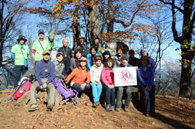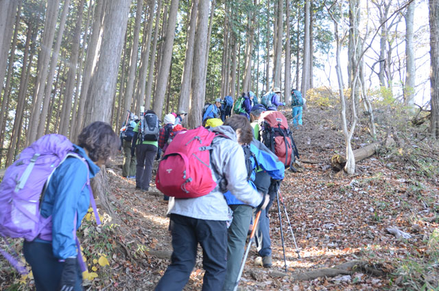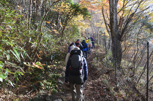 初心者教室から通算して5回目の実習となったが、受講生は相当親しくなっていて、歩いている最中もおしゃべりが尽きない。中にはスタッフと冗談を交わす時もあるほどで、体力もそこそこ付いているようである。日差しは暖かいのだが、影になるとかなり寒い。林越しに目をやると武甲山や有馬山など秩父方面の山々がせまり、来年計画している棒の折山は手前に見えている。現在位置の確認後、記念写真を撮って早々に最高峰の岩茸石山へ向かう。スタッフの指導の下、急斜面を慎重に下っていく。次々と紅葉が現れ、ところどころに霜を見かける。受講生も霜には少しびっくりしたようだった。樹林帯の岩交じりの急坂を登っていくと、展望の素晴らしい岩茸石山山頂である。受講生もその展望の良さに驚き、盛んにシャッターを押している。ここでも現在位置の確認後、スタッフから説明を受け山座同定を行う。この展望をたっぷり堪能し、記念写真を撮って最後の惣岳山へ。