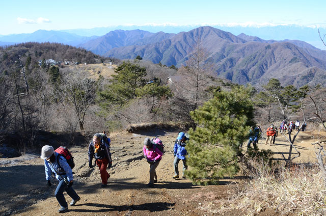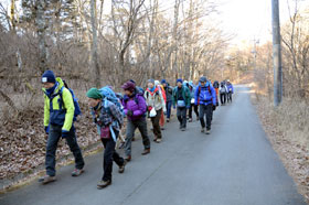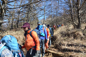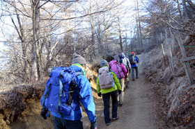 三ツ峠山荘に出ると富士山が右手正面に大きな姿を現し、受講生から歓声が上がる。時間も早いので先に開運山を往復する。途中で南アルプス、八ヶ岳の大展望に皆たたずむ。最後の階段を登ると開運山に飛び出し富士山の雄姿、白い南アルプス、八ヶ岳の展望を再度堪能し、記念写真を撮り、名残惜しくも下山を開始する。三ツ峠山荘に戻り、風も弱いので外の陽だまりのベンチで昼食とする。山荘のご主人からお茶のサービスがあった。協力金を徴収しトイレを借用させていただく。NHKテレビにも出演していた甲斐犬とじゃれて山荘を後にする。木無山方面に移動し広場でアイゼン装着の練習をする。事前に受講生に装着に慣れておくよう伝えていたので装着は比較的短時間でできていた。枯葉で埋もれた急な登山道を西川新倉林道に向け慎重に下る。林道はショートカットしながら鉄塔まで下る。