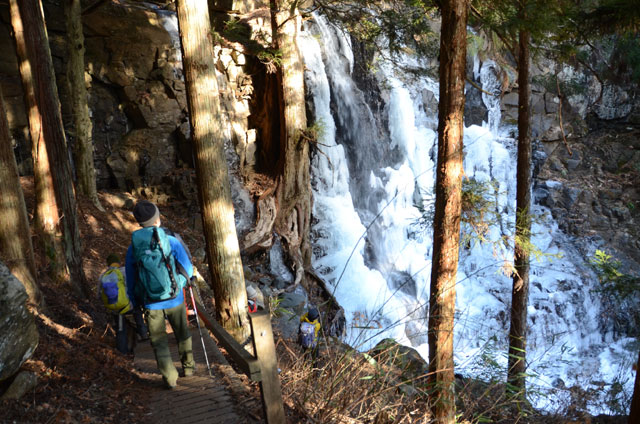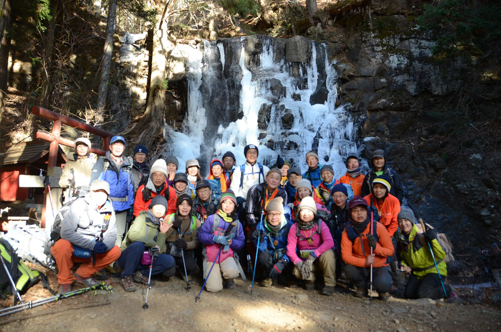 ここで林道を離れ樹林帯の登山道を下って行くと、沢沿いの長い階段道を辿り母の白滝に着くが、上部の長いツララの下を通過する所は、登山道が氷に覆われており、ツララの落下を監視しながら一人ずつ通過する。滝の結氷は70%位だろうか。みごとな氷の自然美を堪能する。ここから林道脇の登山道に下りて、河口浅間神社に出る。立派な杉の大木が立ち並ぶ中を抜け、本堂前にて無事下山のお礼と安全登山を祈願し下山した。帰りのバスも渋滞に合わず順調に立川に帰った。今回の登山教室の目的の半分も達成できなかったが、受講生は天候に恵まれ大展望に満足したことは、登山も天候により左右されることを学んだことだろう。