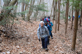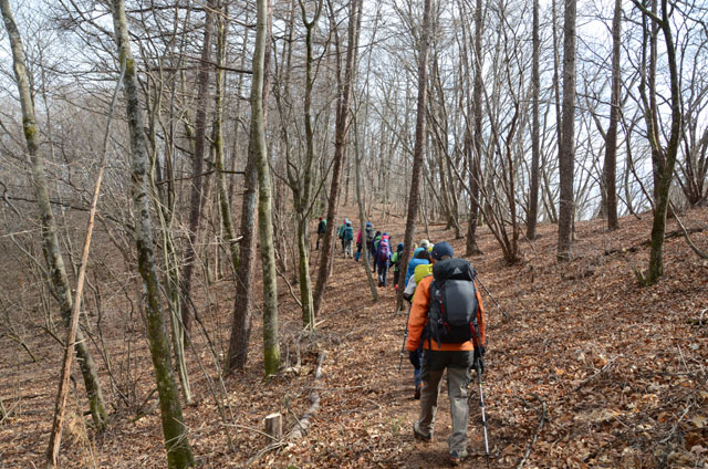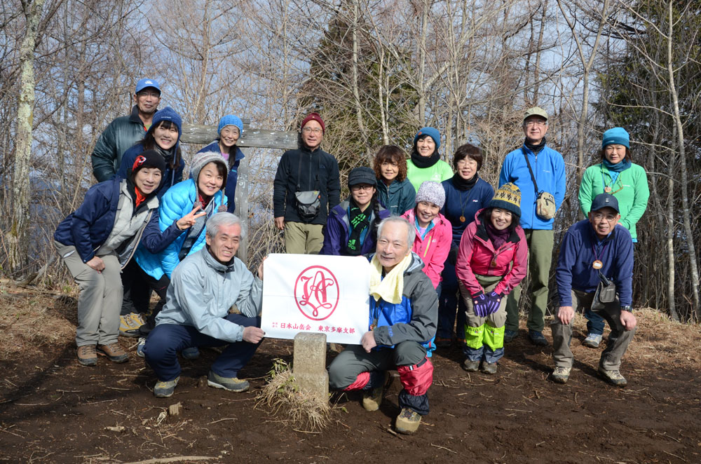 底冷えの曇り空の中、9時出発の増便されたバスに1時間乗車、10時に仲の平バス停近くの広場でミーティングと準備体操ののち出発した。時おり日が射してくる中、集落を抜けて民家横の登山道から登り始める。枯葉が地面いっぱいに敷き詰められていて、カサコソと踏みしめる音も心地よい。雪もなく順調に歩を進める。毎年、この時期には雪中行軍する中で、いろんなエピソードやハプニングが発生していて、あまりに大量の積雪に槇寄山からピストンしたこともあったりしたが、やはり雪がないのはさびしい。2時間でその槇寄山に到着。真っ白の富士山の雄姿を楽しみにしていたが、あいにくの雲でまったく見えない。受講生のみなさんからため息が聞こえてくる。反対方向に目を向けると、昨年初心者教室で登った奥多摩三山を望むことができた。受講生のみなさんにとっては、自分で登った山を他の山の山頂からの視点で見ることに感慨深げであった。ここで昼食を摂り記念撮影後、笹尾根の縦走に向かう。
