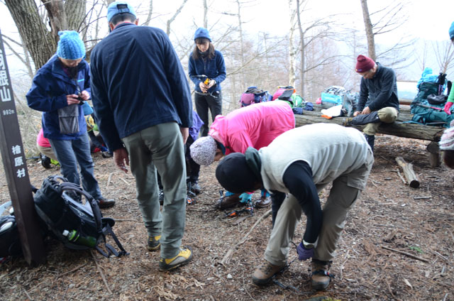 笹尾根ではアイゼン歩行をやりますよと、事前にアイゼンの用意をお願いしていた。宮崎講師の紹介で11名の受講生が新たにアイゼンを購入。12月の座学では用意したアイゼンで装着方法や注意点などをレクチャーして、雪山歩行への準備は万全であった。ところが、降雪の情報は日本海側のみで、関東には雪が降ることはなかった。直前に下見をしたところ、まったく雪はなく、自然が相手ではやむを得ない。それでも、アイゼンの脱着訓練は必要とのことで持参するようお願いをしておいたが、事情により7名の受講生が欠席。参加者10名に対してスタッフは8名となった。