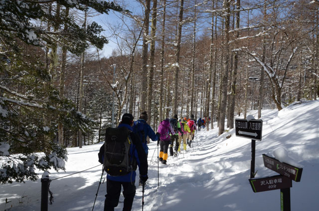 全員スノーシューを抱えてゴンドラに乗り込む。快晴の空の向こうに八ヶ岳が望まれる。ゴンドラ頂上駅でトイレ、ミーティング、準備体操、スノーシュー装着を済ませ出発する。やはり雪質が良くトレースのある雪道を歩く。周りには動物の足跡も見られる。徐々に受講生もスノーシューに慣れてくる。