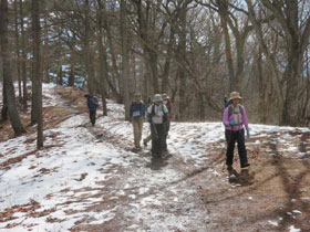 予定より若干遅く山頂に着いたものの、やはり雲に隠れて富士山は望めない。それでも大月市街が一望のもとに眺められ、初登頂となった受講生はさかんにシャッターを押していた。記念撮影後、扇山への急な下りへとかかる。ここも懸念された雪はまったくなく、ストック片手に周りの枝を掴みつつ慎重に降りてゆく。今回5回目の実習のせいか、途中からその下りを楽しんでいるかのように、受講生は冗談をいいながら下っていた。予定より20分遅れで宮谷分岐に到着。昼食とした。百蔵山の山頂ではあんなに登山者がいたのに、さすがに扇山への縦走者は数える程度しかいない。最初の高川山から徐々に歩行負荷が増えている中で、受講生は確実にレベルを上げている。扇山への急斜面の長い登りはその意味を再確認するものとなった。百蔵山の登りでもう限界と弱音を吐いている受講生がいたが、特に問題なく大久保山まで登り切り、他の受講生も黙々と登りながらも休憩ごとに冗談を言い合うなど、余裕を感じさせる。