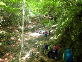 いきなりの急登が続き九十九折の道を息を整えつつ登つて行くと陽が射してきて、エゾハルゼミが賑やかに鳴き始めた。