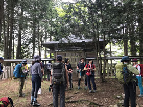 1時間程で高度を300M位上げてゆく。水松山分岐に14:00までに到着出来なければ引き返す予定になっているので、心して登ってゆく。急登の連続に皆汗だくになりながらも頑張りどころだ。11:20今は訪れる人もまばらな天祖神社に到着。山行の安全を祈願し手を合わせる。