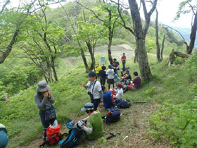ここからタワ尾根分岐までは比較的緩やかな道が続き、満開のミツバツツジやクワガタ草を愛でる余裕も出てきた。木陰の広い場所を選んで20分間昼食休憩、その後木漏れ日の中を気持ちよく歩きヘリポートに到着した。