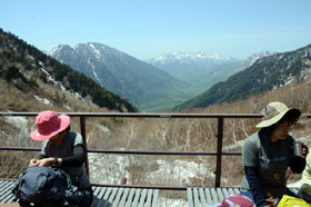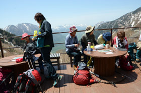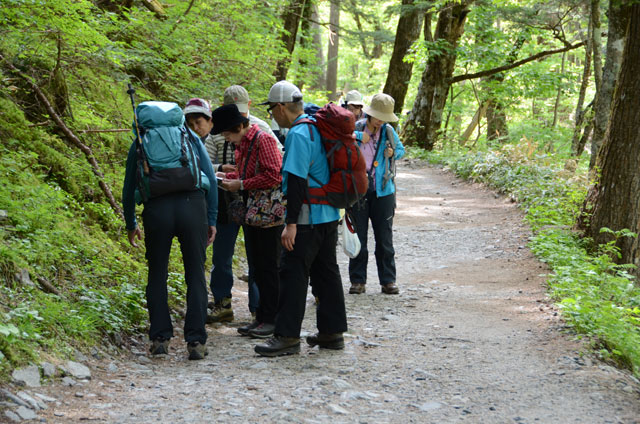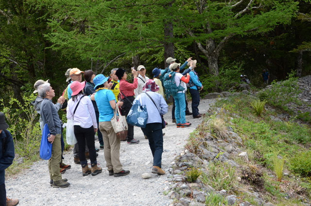 10時過ぎに岳沢小屋に着き早めの昼食とした。昨日に引き続き快晴に恵まれ、展望台からは乗鞍岳の全貌や大正池から河童橋までの風景、霞沢岳など上高地ならではの眺めに受講生たちは盛んにスマホのシャッターを切っていた。眺望を満喫して11時前に下山に取りかかる。眺めのいい場所を選んで休憩を取り、樹林帯に入るあたりでは受講生は名残惜しそうであった。
