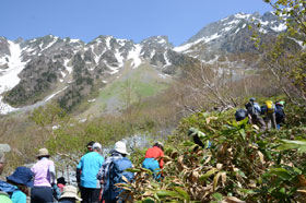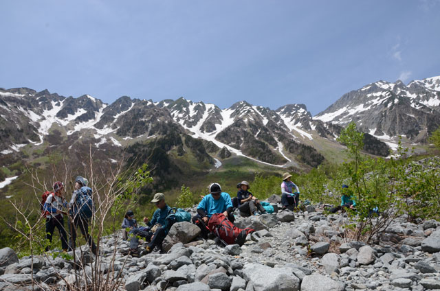 翌日は5:30から朝食。準備を整え出発15分前に山研前の広場に全員集合した。体操・ミーティングの後、班ごとに出発。今年は雪が少なく、ようやく雪が現れたのは岳沢の小屋近くに来た時だった。標高を上げるに従い穂高の峰々が近くに現れ始め、樹林帯を越えたあたりで受講生は声を上げていた。これまで登ってきた山とは一線を画すその雄姿は、初めて目の当りにする人にはひとしおであったようだ。。
