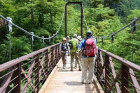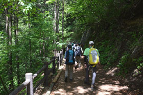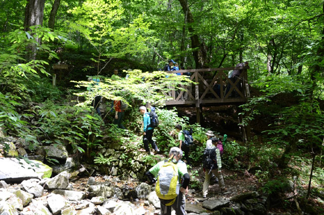 沢沿いの登山道を小鳥の声に励ませながら、時々石伝いに沢を渡り、休憩テラスで一休みする。受講生は皆元気である。