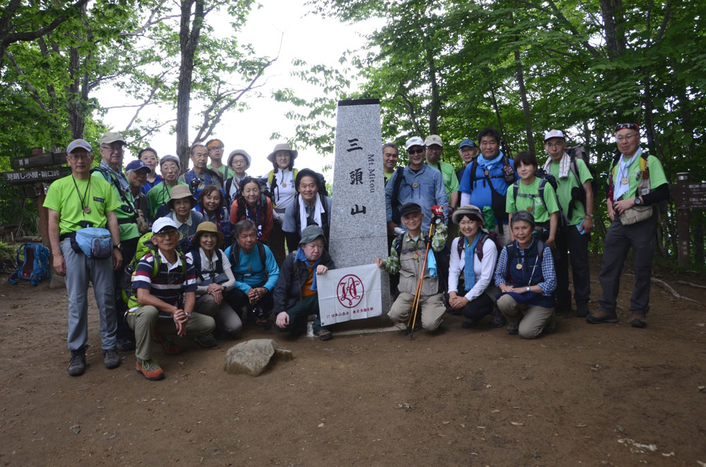 再度ムシカリ峠に戻り、三頭山に向け階段をゆっくり登り、三頭山西峰に出る。受講生とスタッフはハイタッチをし登頂を祝う。残念ながら富士山は望めないが北側方面には鷹ノ巣山などの石尾根が木の枝越しに望めた。記念撮影後、下山を開始する。下山途中でギンリョウソウを見つける。再び避難小屋に戻りトイレを済ませ、ムシカリ峠から下山する。滑り易い所があるので受講生に注意喚起しながら休憩テラスまで下りると受講生もホットしたようである。森林館に戻り整理体操後に森林館見学の時間を取る。森林館に支部の「多摩百山」が置かれていたのが印象的であった。受講生にも支部ホームページをピーアールした。帰りのバスも順調で、受講生を含め心地よい眠りについた。初回の登山実習で受講生から楽しい山登りができたとの声があり、登山実習に参加していない受講生にも是非参加を促したい。