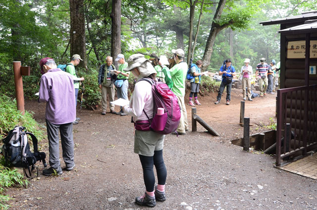 6月の三頭山に引き続き、今回の大岳山も天気予報では悪く、台風の影響もありそうで、受講生からの実施の問合わせも多かったが、雨具着用しての山行経験などと受講生を納得させて、予定通り実施した。どうやら夜半には雨は止んだが、奥多摩、丹沢方面は雲に覆われている。やはり予想通りどこかで雨具着用の場面がありそうだ。今回も受講生の集まりが良く、また渋滞もなくスムースにケーブル滝本駅に到着した。