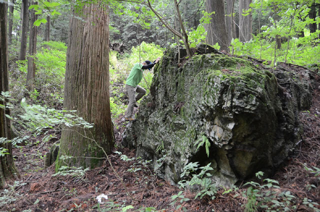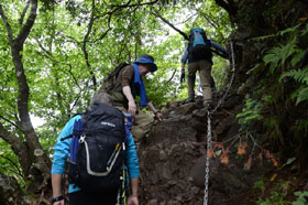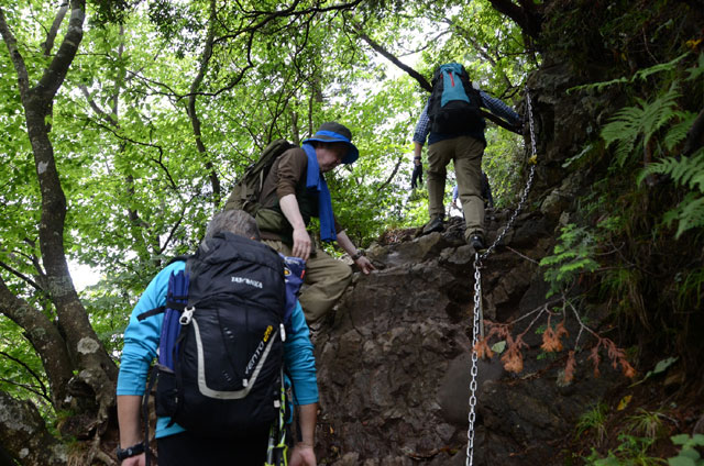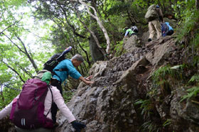 御師集落を抜け、御岳神社の階段途中から登山道に入る。今回の受講生への宿題は、地図にルートを記載することだが、長尾平付近の登山道がポイントとなる。奥ノ院の分岐を分け、芥場峠への登りはゆっくりと登る。峠に出ると峠を渡る風にホットする。日差しがない分、暑くもなく、比較的快適な登山となる。鉄の階段、鎖場などを通過し、大岳神社下の広場で昼食をとる。昼食後、これからの岩場通過に向け、広場前の小さな岩で三点支持や岩場通過の際の足場の動きなどのデモンストレーションを中村班リーダーに実演してもらう。