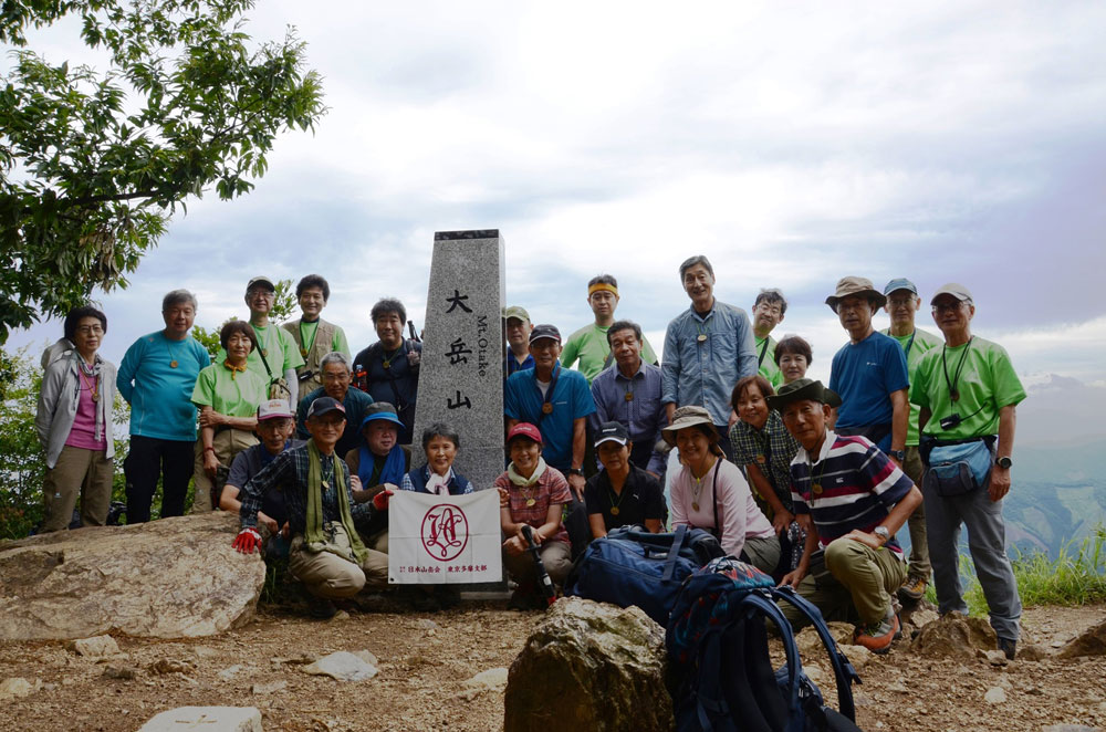 いよいよ最後の岩場通過も渋滞もなくスムースに登り大岳山頂上へ。さすがに富士山は見えないものの8月に登る御前山が大きな姿を見せていた。残念だが6月に登った三頭山の頂は雲の中である。記念撮影後、下山にかかる。岩場の下山は注意喚起をしながら無事通過し、一気に芥場峠まで下る。受講生も少しずつしっかり歩けるようになってきている。御師集落では都指定文化財で茅葺の屋根に杉皮仕上げが完成した馬場住宅を鑑賞しながら御岳山駅に戻る。広場前の展望台からは東京スカイツリーが見えるまで天気も回復していた。ケーブル、貸切バスとの接続もスムースで順調に帰路のバスに乗り込んだ。今回は天気の判断が微妙であったが、雨に降られず、そこそこの展望に恵まれラッキーな山行であった。初心者最後の登山実習「御前山」もこうあって欲しいものだ。