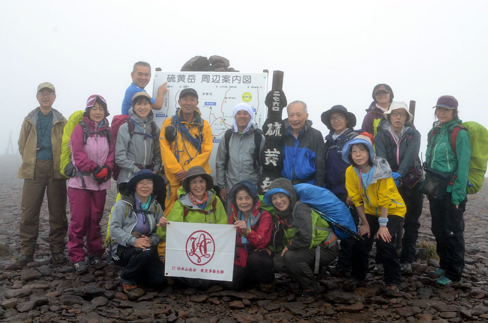 時おり鳥のさえずりが聞こえ、天候が回復基調の兆しと思えたが、雨は降ったりやんだりの繰り返し。数か所の沢を越える際も、懸念した増水は目立ったほどではなく、ほぼ計画通りの時間に赤岩の頭に到着。その間、体調不良を訴える受講生もおらず、ガスは出ていたものの視界もあり、予定通り山頂に向かう。山頂直下の岩場をスタッフが声掛けをしながら慎重に通過する。やがて、広い山頂に到着。相変わらずガスがあたりを覆っていて、やはり展望は得られなかった。それでも初めての3000m級の山に登頂した受講生は身体全体で喜びを表していた。