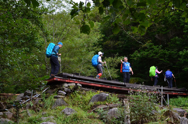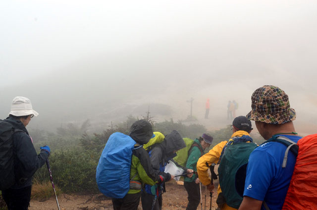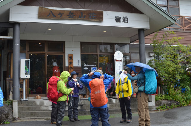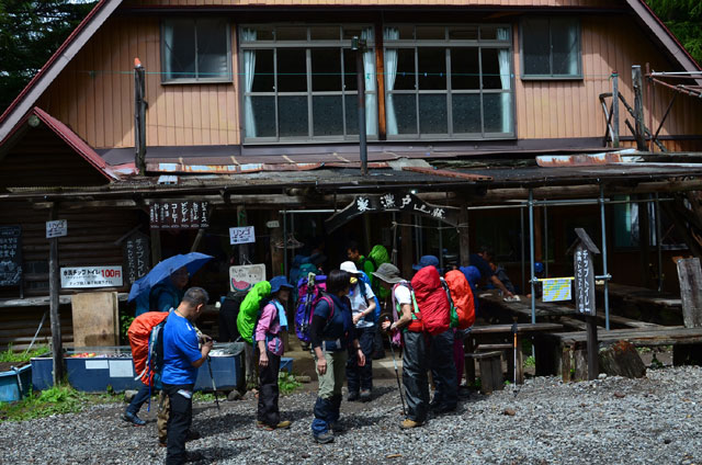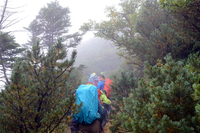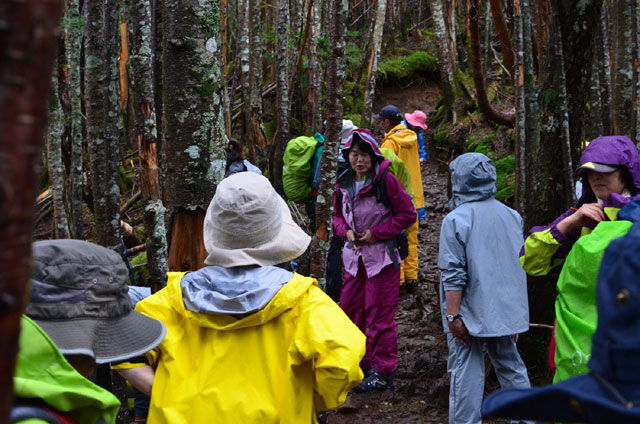 夜、トイレに行くと外はひどい雨で窓にたたきつける音もすごかった。朝食を摂っている際も雨は降り続いていて、様子見で出発を少し遅らせることにした。ここで受講生の1名から体調不良で参加を辞退したいとの申し出があり、山荘で待機することになった。すると突然、雨がやみあたりが少し明るくなってきた。全員で表に出て体操・ミーティングの後、慌ただしく20分遅れの出発となった。森林限界までは、しばらく樹林帯が続く。この雨の割には他の登山者が多く、追い抜かれるたびに歩を止めることが頻繁にあった。