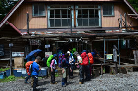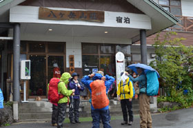 ここで一旦、荷物を部屋に置き、空身で中山展望台まで足を延ばす。天気に恵まれれば、赤岳・阿弥陀岳の展望が素晴らしいところだが、この天候ではガスが展望を遮ってしまい、わずかに稜線の山小屋が見えた程度だった。受講生の落胆ぶりが耳に痛い。記念写真を撮って山荘に引き返す。この天候にしては宿泊客が多いとのこと。評判の夕食後、持参したワインで懇親会を開催。今回は2回目の宿泊を伴う山行であり、話題も山に対する思い入れや実際に取り組んでいる山行体験などで大いに盛り上がり、受講生・スタッフ双方とも前回以上に懇親を深めたようだった。しばらくの歓談ののち明日の早朝出発のため、早々にお開きとして就寝した。