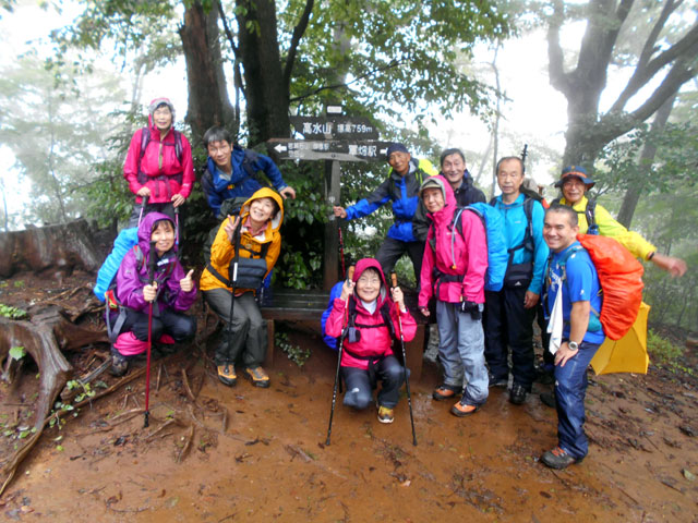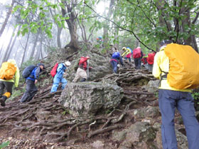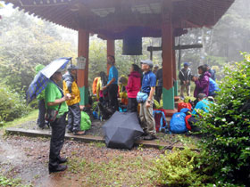 集合場所の軍畑駅に着くと小雨が降っており、やはり今日一日は雨のようである。スタッフを入れると40名の大人数で、駅前広場では他の人に迷惑になるので、雨具を着用し早々に出発する。登山口手前の高源寺境内を借用し、ミーティング、準備体操、衣服調整などを行う。特に、新受講生を重点的にアドバイスする。やはり、雨が降っていて皆、気が重そうである。何とか鼓舞して出発する。