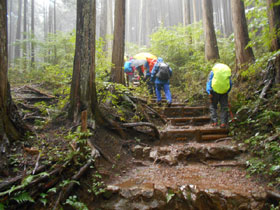 ここからの下りは、通常、水場まで行き、御嶽駅への登山道を右に分け、登り返すルートであるが、惣岳山から直接沢井駅方面に行くルートを宮崎講師からアドバイスを受け、降り口まで様子を見に行き、しっかりした登山道を確認し、このルートを使用した。後は、少し長いルートを下るだけだが、一部滑り易い所は、注意して下る。生活道に出るころには、雨も上がってきた。沢井駅までの車道を歩き、駅に到着した。トイレ、整理体操、次回山行計画の説明などをして解散した。