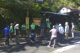 峰谷バス停到着後、トイレタイム、体操の後、宮崎講師から行程の説明と注意事項のお話があった。