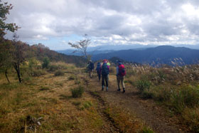 峰谷バス停から東京都で最も標高の高い集落と言われる奥集落を目指す。数日前からは想像がつかないくらいの暑さ、日差しで山頂からの眺望を楽しみにする受講生の声が聞こえた。静かな樹林帯を抜けたところで振り返ると、向かい側の斜面に峰谷の集落がよく見えた。周りの山々は少し紅葉が始まっている。
