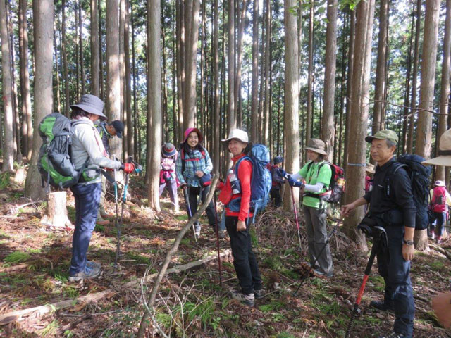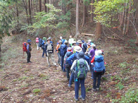 黒山からは一旦鞍部まで下り権次入峠まで登り返す途中で登山道を外れた班があった。トランシーバーで権次入峠へ正規のルートに誘導する。ここまでくると他山者が急に増える。棒ノ折山にはもう一踏ん張りの登りである。頂上近くになると頂上の登山者の声が聞こえてくる。広い頂上に出ると、武甲山を代表とする秩父の山並みが見える。さすがに上信越の山並みは雲の中である。全員の記念撮影後下山を開始する。ストック所有者にはストックを使用させる。杉の枝が多量に落ちている急な登山道を慎重に下る。一旦なだらかになった登山道脇で休憩をとる。急な登山道を降りて皆ホットしているが、この先も急な階段の登山道が続くため注意喚起を促す。天気予報では午後山では不安定な天気になると言っていた通り、あやしい雲が出てきたが何とかバス停までは持つだろう。権次入沢のワサビ畑脇の登山道を行く。足部が悪く以外に時間がかかる。奥茶屋に出てホットする。後は舗装されて林道を清東橋バス停までこの山行を噛みしめながら予定より1時間以上も早く到着した。