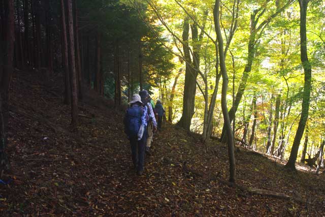 穴路峠分岐を過ぎつづれ折れの道を進む。高度が上がるにつれて青空が垣間見え紅葉も綺麗だ。