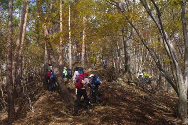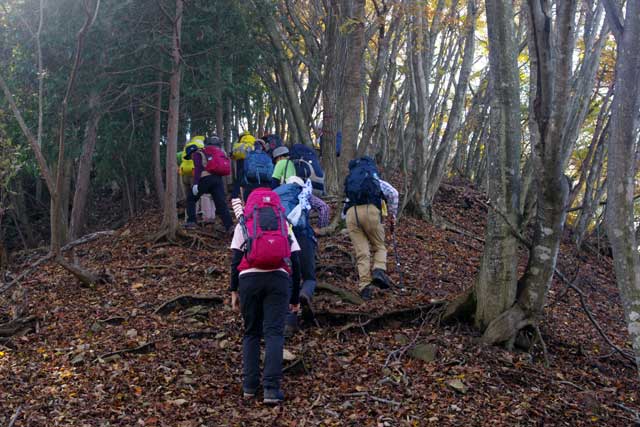 急坂を頑張ると高畑山山頂に出た。集合写真を撮り30分の休憩をとった。写真を撮りあったり軽食を摂ったりした。宮崎講師からこれから急な下りになること、ストック持参者には使用のすすめ、倉岳山の登りの注意事項の話しがあり、まだ先があると気を引き締めた顔になる。