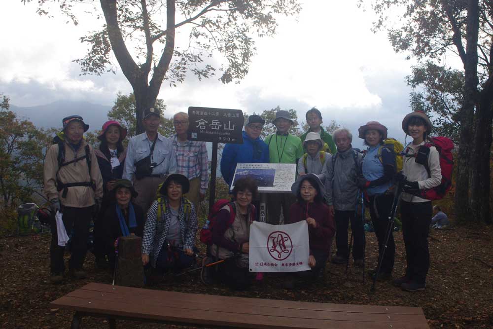 倉岳山手前の最後の急登も荒れ気味だった。山頂で二度目の集合写真を撮ったが富士山は雲に隠れ不参加になった。他の登山客に交じって昼食休憩をとった。