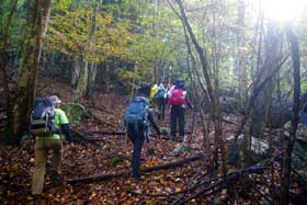 1班の後に2班が続いて出発した。虹吹橋を渡り小篠の集落を過ぎるた金網ゲートで、衣類の調整と水分補給をした。 小篠貯水池を過ぎたオシノ沢沿いの道は落ち葉で不明瞭な所もあった。