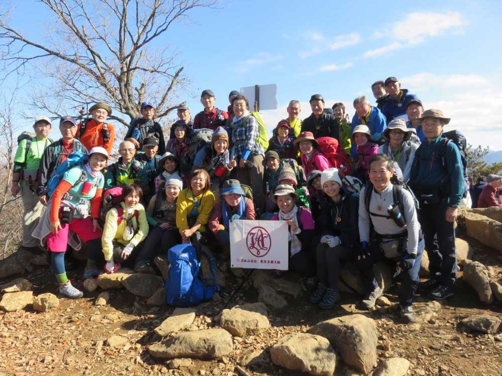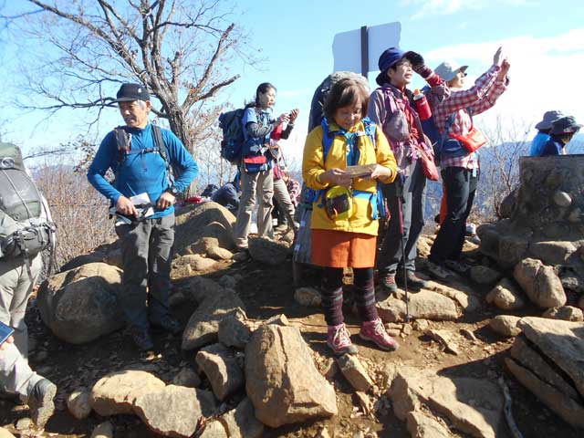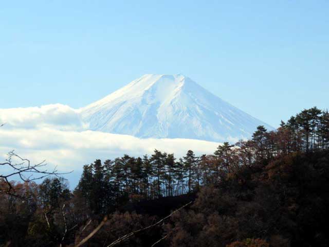 樹林帯の中の登山道をゆっくり登る。木々の間から木漏れ日が心地よい。男坂の分岐を左に見送り女坂を登る。トラバース道の固定ロープ付近を慎重に通過する。トラバース道の歩き方をアドバイスする。しばらく進むと左手に真っ白で雄大な富士山に歓声が湧く。男坂合流点先の平坦な尾根で休息をとる。ここから高川山頂上までは直ぐである。期待した富士山は一部雲に隠れ始めていた。思い思いに写真を撮る。いつもと比べ頂上は登山者も多くなく、何とか頂上で全員写真を撮る。