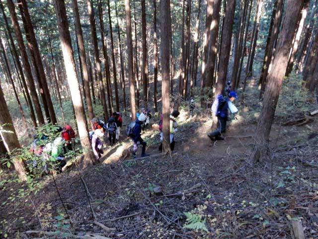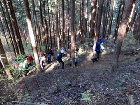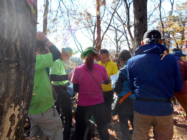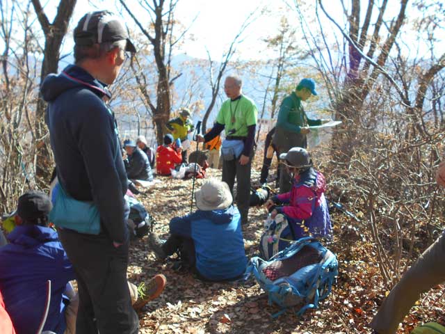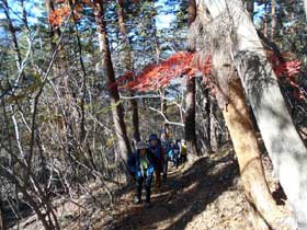 頂上からの下りは急で滑り易いのでストックを出して対応する。鞍部先の平坦な昼食場所は先行のグループが昼食を終え移動するところで、入替えがスムーズであった。昼食後にストックの取り扱いをアドバイスし、これからの急な下りに注意喚起する。鞍部まで戻り分岐から電光型の急な下りを降りる。所々の紅葉が陽に当たり綺麗である。落ち葉の多い登山道に注意しながら林道に出る。