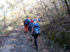 陽当たりのよい林道脇広場で班リーダー3人の持ち物点検を班ごとに実施した。班リーダーが色々なものをコンパクトに詰めてあることに受講生から感嘆の声が上がる。やはり受講生に比べてザックの重量も重いようである。量りを持参し班リーダーと受講生のザック重量を比べてみたいものだ。里山の林道を歩きながら周辺の風景を楽しむ。舗装された道に出て淡々と歩き禾生駅に予定より1時間も早く着いた。歩行時間が短いこともあり、受講生の足並みが徐々に揃ってきたのを実感した。12月講座時の説明などを話し解散とした。大月行きの電車は、トーマスのラッピング電車となり、車体外部だけでなく車内にもラッピングや記念撮影用座席も用意された車両に最後まで楽しませてもらった山行となった。