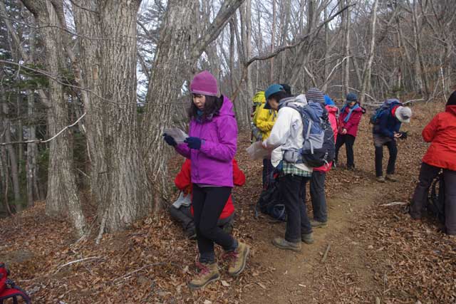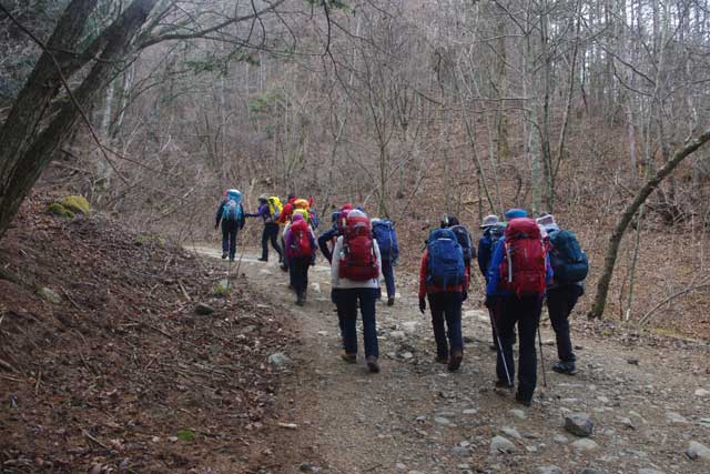 気温が低く、土が凍って大きな霜柱となっていた。上の山荘まで自動車が入るため、道が荒れていて歩きにくい。冬枯れた林道、空はどんよりと曇っているが、久しぶりの登山教室の仲間達との山行を皆楽しんでいるようだ。
