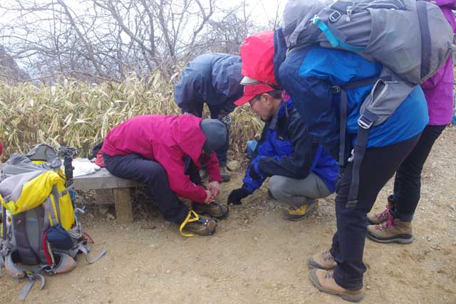 三ツ峠山荘に着くと、下の町並みは見えるが富士山は全く見えず、時折ガスが流れて来て視界を覆う。積雪は無かったが、先の広場でアイゼンの装着訓練を行った。