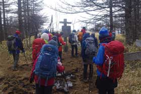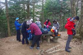 その後、開運山に登ったが風が強く、視界も無い。記念写真を撮り、早々に下山した。再び三ツ峠山荘に到着、昼食とする。山荘の方にベンチやテーブルを貸して頂き、ゆっくりと休むことが出来た。
