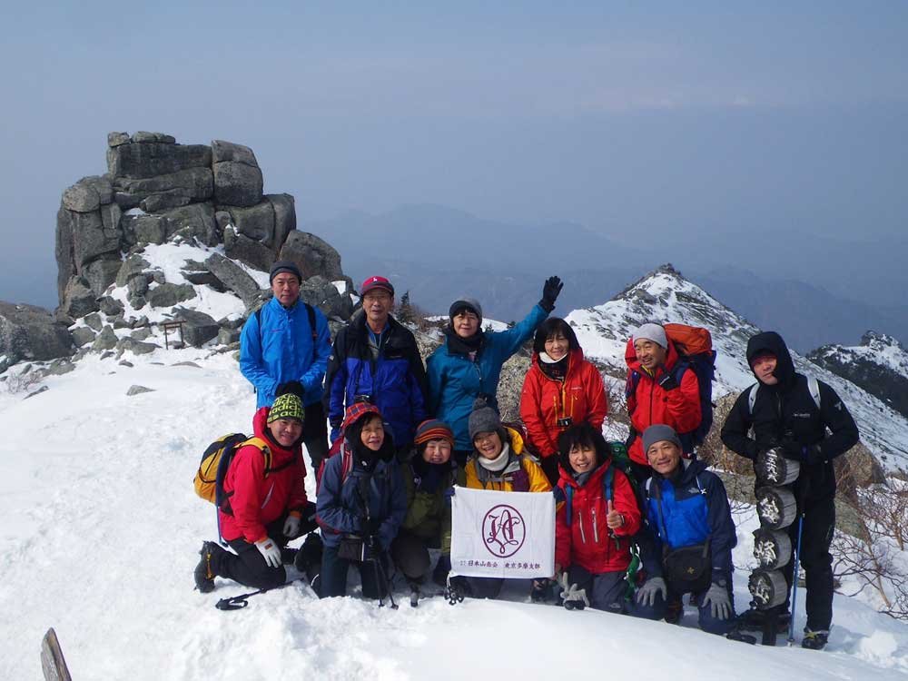 12時、瑞牆山へ出発する。テント装備等を下ろした軽量のザックやアタックザツクで山頂へ向かうメンバーの足取りも当初は軽やかだったが、20分ほど歩くと登山道の凍結箇所が増えてきて滑らないようにゆっくり慎重に歩いた。しかし転倒してしまうメンバーもでた。その後アイゼンを装着して、桃太郎岩を通過して積雪の急登を超えて14時45分標高2,230メートルの瑞牆山の山頂へ到着。引き続き天候に恵まれ、日差したっぷりの気持ちがいい山頂に名残惜しいが、長居はせずに17時に富士見平小屋に戻った。