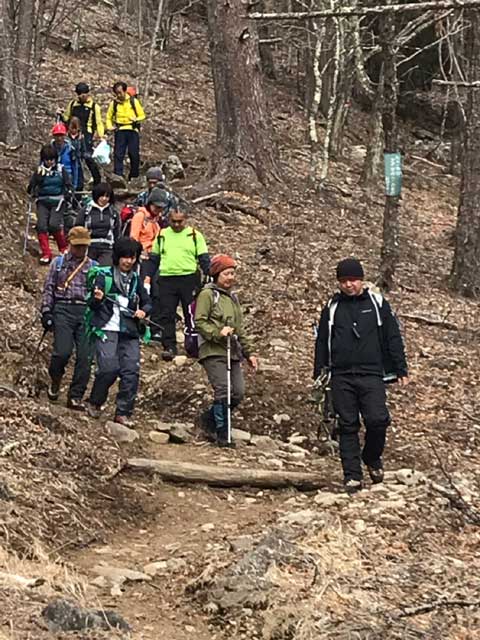 8時40分、2年目に突入した中級登山教室で鍛えられたメンバーのザックはどれも大型で、テン泊と防寒装備に、宴会時の嗜好品が詰まったザックを軽々と担いで、韮崎駅に集合した。2台のジャンボタクシーに分乗して、約1時間で瑞牆山荘前の登山口に到着した。登山口で待ち合わせの北島講師と合流して、今回の14人のメンバー全員が揃う。準備体操をして各自出発の準備をしていると、宮崎講師から、「準備体操が終わったら直ぐに出発、体が冷えるから。出発の準備がまだ終わっていないなら、全て終わらせてから準備体操」とのアドバイスがありました。