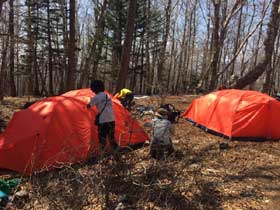 10時、まずはテント泊予定地の富士見平小屋へ向けて出発。青空が広がり、暖かな日差しの下を歩き、10時50分富士見平小屋へ到着。テントを張る場所に積雪はなかった。瑞牆山へ向かう前に、テント設営。不慣れなメンバーも多く右往左往しながら30分ほどで3張のテントの設営が完了したが、宮崎講師から「テントの設営がダメ、学生だったらやり直しをさせる。自分のテントの設営が終わっても、他の人が設営をしていたら手伝う」とのアドバイスがあった。