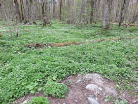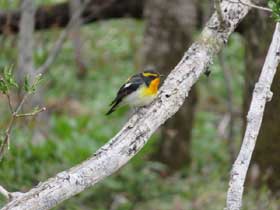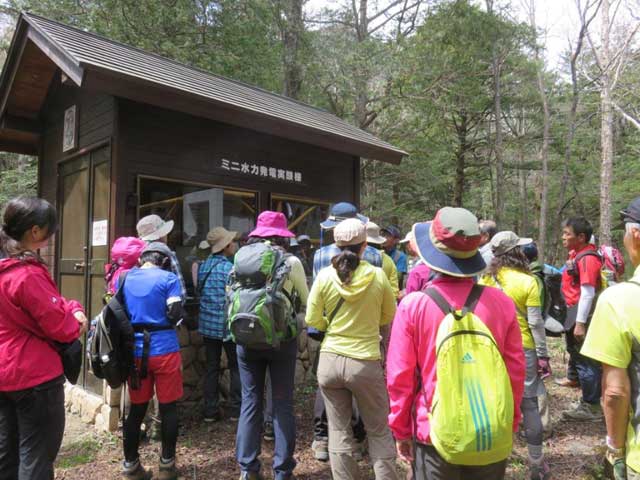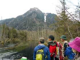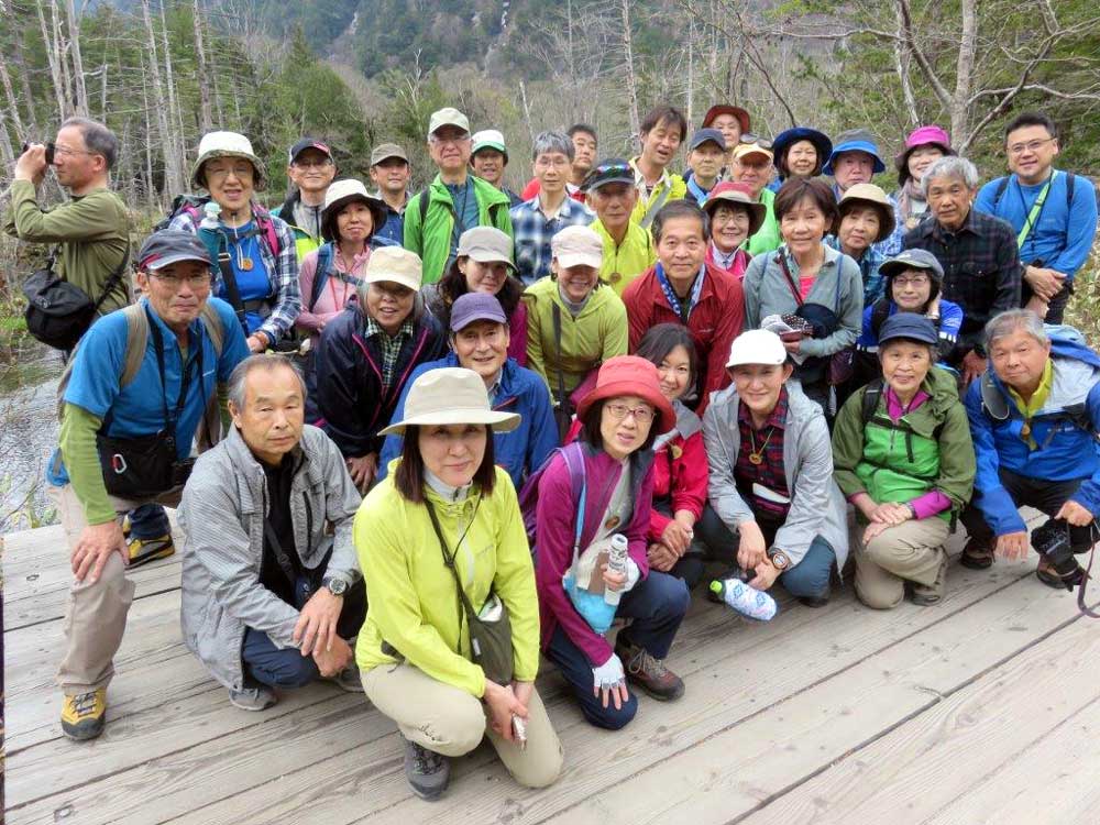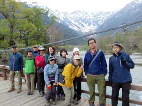 梓川沿いの歩道に出ると穂高連峰が望め一斉に歓声が上がる。山研に入って昼食とする。炊事や食堂の配置、寝具の移動などでスタッフ6名を残し、明神までの散策に出る。種々の花などが見られるものの、今年は花が少ないようだ。明神で枝に止まったキビタキが人前でも逃げずにカメラの放列となる。その先ではニリンソウの大群落にホットする。これで受講生も満足と思われた。明神橋を渡り梓川右岸を行く。途中スタッフ3名が上がってきて合流する。ここでも沢の中のイワナや直ぐ近くでのウグイスの鳴き声、姿に感動する。