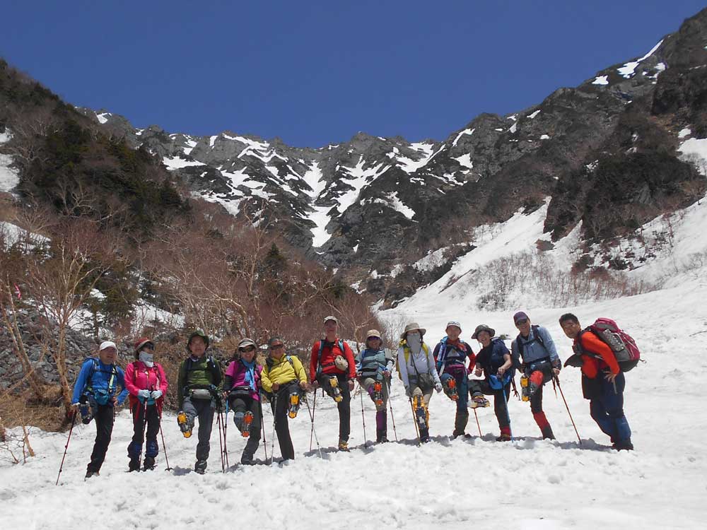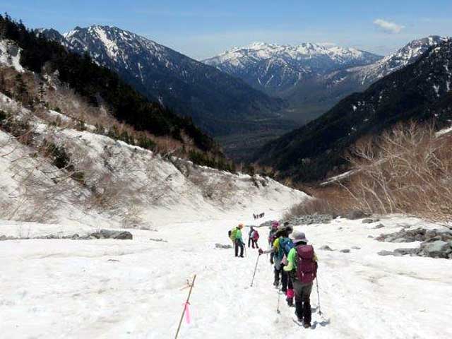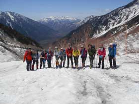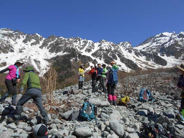 更に高度を稼いで雪渓に入って、軽アイゼンを着用する。少し雪が柔らかくなり始めている。受講生にとって初めてのアイゼン歩行となる。歩行などを重点的にアドバイスする。岳沢小屋では、360°の展望を楽しんでの昼食となる。集合写真などを撮り、名残惜しいが下山を開始する。雪渓部分および一部岩が露出した登山道をアイゼン着用で歩行してもらった。途中でアイゼンを外す。登りで凍結していた部分も、溶けて大分歩きやすくなった。治山道路に出てホットする。