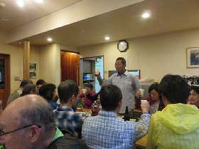 山研に戻り食堂に入ると、豪華な食卓にまたも感動である。女性スタッフの奮闘に感謝である。受講生との懇親を兼ねて夕食がスタートした。食卓は班単位のブロックにうまく分けられた。今回から班メンバーが新しくなったので、コミュニケーションの場として良かった。食事とアルコールと歓談で大いに盛り上がる。食事の片づけも皆で協同作業である。それぞれ心地よい眠りに入った。