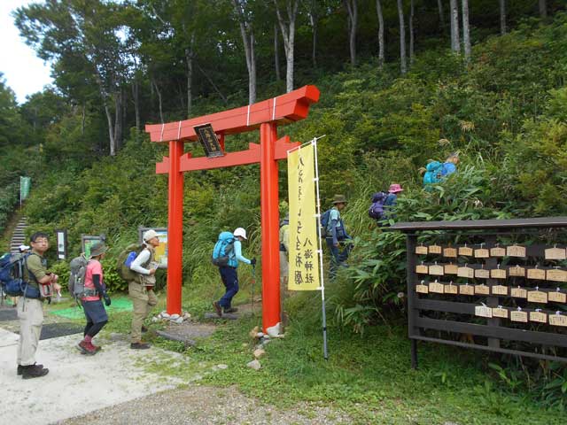 歩き出して30分、ユキザサの緑色の実が私達一行を迎えてくれ、秋の訪れを感じることができた。4合目出会で、紅白の布を巻き付けた柱を背負子で運ぶメンバーと出会う。