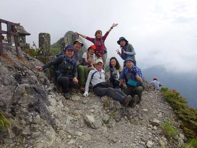山頂で上棟式か?と思いきや、大学受験の合格祈願の祈願柱らしい。それを9合目の千本檜小屋へ奉納するため生徒・教師・保護者ら200名余りの軍団で登山中だったのだ。