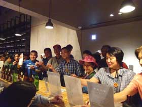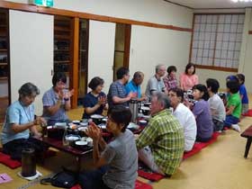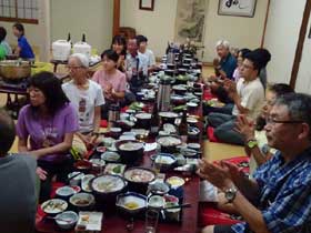 昼食場所は「八海山みんなの社員食堂」社食とは思えぬモダンな建物でいただいたツヤツヤに輝く魚沼産コシヒカリのおいしさに感動する。そして食後は、「猿倉山ビール醸造所」で醸造タンクを眺めながらビールのグラスを傾ける。「八海山雪室」の施設に移動して、バスの出発までは、試飲や雪室見学、石動(いするぎ)神社に参拝する等、自由時間を満喫する。更に「千年こうじや本店」でも、試飲をしながら各自お土産を購入する。 15分ほどで本日の宿「民宿やまなみ」着くと、八海山が正面に大きく見えてテンションも上がる。18時からの夕食は大広間の座敷で、宮崎さんの乾杯で始まり、おいしいお酒とおいしいごはんをいただく。食事の合間に、各参加者には自己紹介と「好きな山、最近登った山、これから行きたい山」等について一言いただく。自己紹介に続いて「行動班対抗の山のクイズ大会」で、大いに盛り上がり修了生同士の懇親が更に深まる。野口支部長の中締めの後の2次会も盛況で楽しい山行前夜となる。