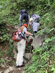 薬師岳の直前に長いくさり場が登場!緊張感が一気に増し、リーダー・諸先輩より『足掛かりを確認して!・・クサリに体を預けて!・・』など檄がとび、全員が見守られながらクリアーする。