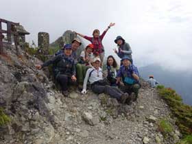 狭い山頂で、すぐ先に八ツ峰が見える。20分程で千本檜小屋に到着、予定通りここで昼食をとる。小屋の周りに先程無線で聞いた200名程の団体の先発隊がいて、登山道で休憩している生徒がいたりとても混雑している。昼食を済ませて、次の地蔵岳への登山道も距離こそ短いが狭い尾根やクサリ場ですれ違いには時間がかかり、12時20分に不動岳に到着する。不動岳の手前のクサリ場の最後は要注意でクサリ場の上が狭い尾根で勢い良く登り肝を冷やした。ちなみに尾根を左(北西)に進むと地蔵岳で右(南東)に進みと不動岳である。地蔵岳山頂からは、本日の折り返し点の不動岳山頂を拝むことができるほどの距離だが、狭い尾根の通過には注意が必要である。12時半に地蔵岳に到着。地蔵岳の山頂には「この先はクサリ場の連続で非常に危険」と書いてあるが、いつかは挑戦したい。集合写真を撮って下山を開始する。